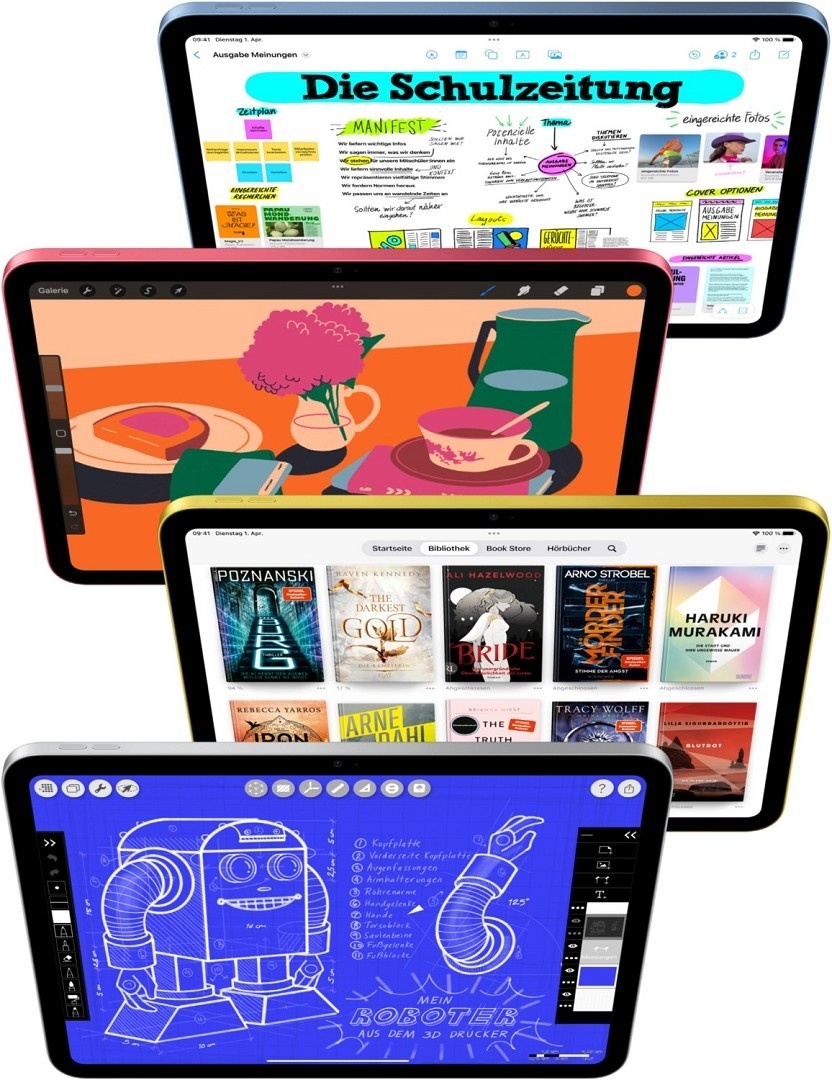 ⁴ USB-C auf Apple Pencil Adapter für Kompatibilität mit dem iPad (A16) und dem iPad (10. Generation) erforderlich. Änderungen an der Verfügbarkeit vorbehalten.