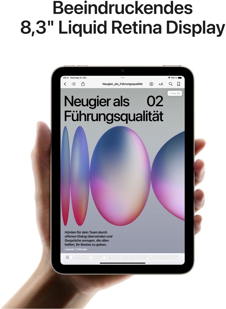 - 8,3" LIQUID RETINA DISPLAY¹ - Das fantastische Liquid Retina Display kommt mit fortschrittlichen Technologien wie einem großen P3 Farbraum, True Tone und einer äußerst geringen Spiegelung. Dadurch sieht alles absolut brillant aus