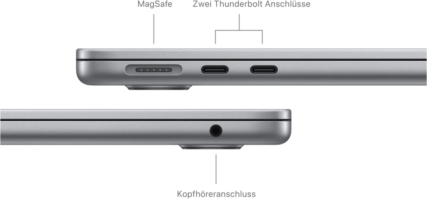 - GUTE CONNECTIONS – Das MacBook Air hat zwei Thunderbolt Anschlüsse, einen Kopfhöreranschluss, WLAN 6E4, Bluetooth 5.3 und einen MagSafe Ladeanschluss. Und es unterstützt bis zu zwei externe Displays, wenn der Laptop zugeklappt ist