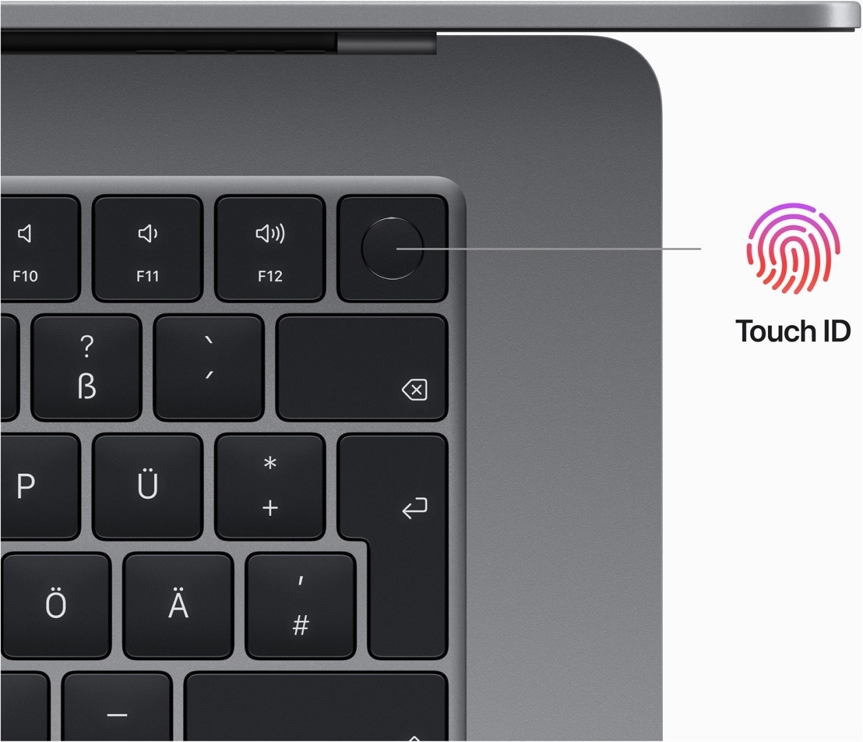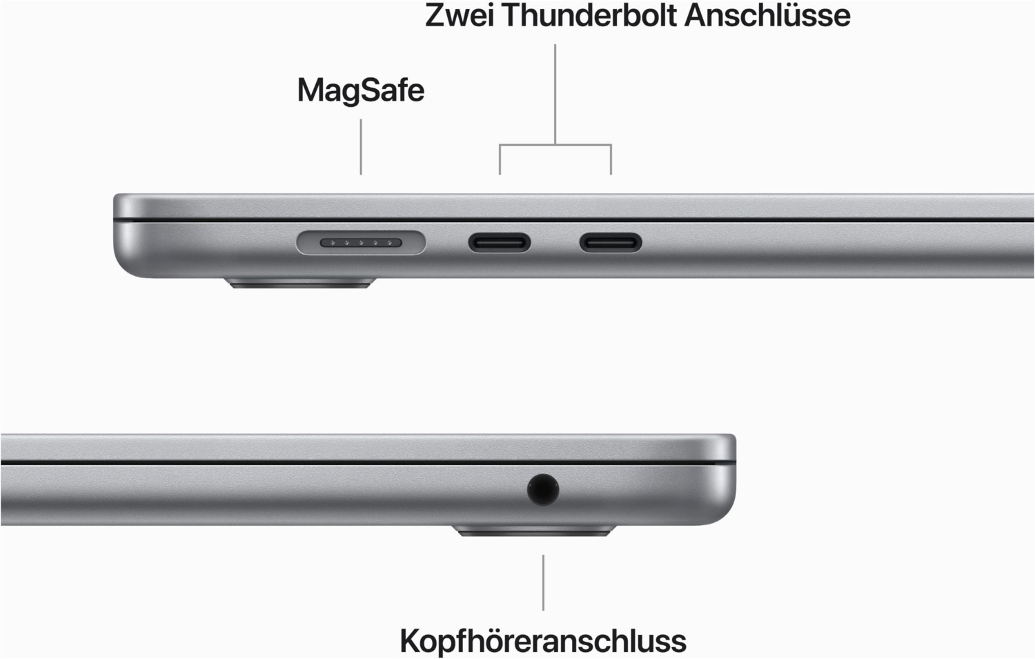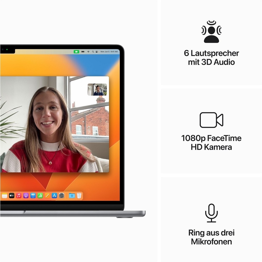 - MagSafe 3 Anschluss, zwei Thunderbolt Anschlüsse und Kopfhöreranschluss, beleuchtetes Magic Keyboard und Touch ID für sicheres Entsperren und Bezahlen, schnelle drahtlose Verbindungen mit WLAN 6