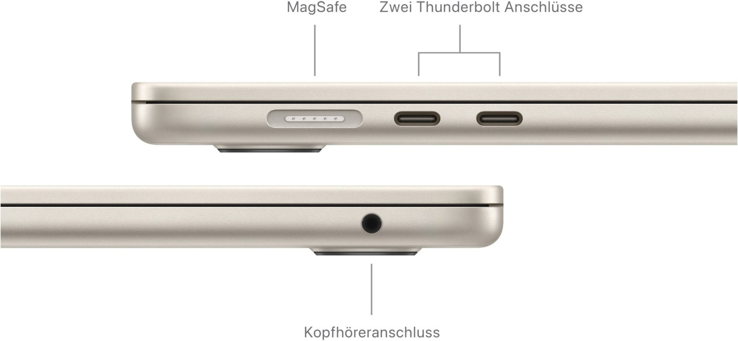 - GUTE CONNECTIONS – Das MacBook Air hat zwei Thunderbolt Anschlüsse, einen Kopfhöreranschluss, WLAN 6E4, Bluetooth 5.3 und einen MagSafe Ladeanschluss. Und es unterstützt bis zu zwei externe Displays, wenn der Laptop zugeklappt ist