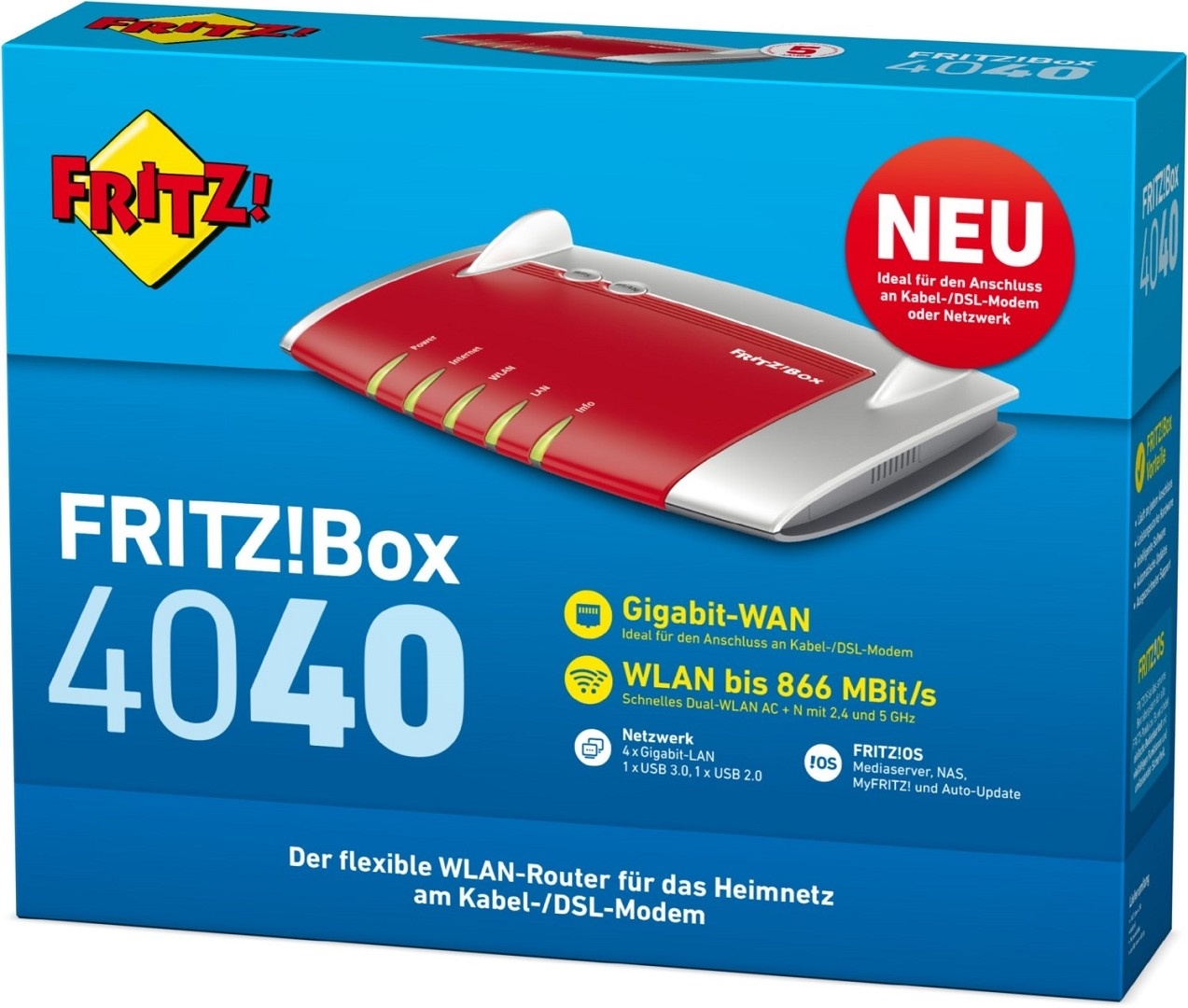 Als WLAN-Router ohne integriertes Modem wird die FRITZ!Box 4040 zum flexiblen Allrounder in jedem Heimnetz und an allen Internetzugangspunkten. An ein vorhandenes Modem oder Netzwerk bringt die FRITZ!Box 4040 leistungsstarkes WLAN AC + N, 4 ultraschnelle Gigabit-Anschlüsse, 2 USB-Schnittstellen (USB 3.0 und 2.0) und ermöglicht damit anspruchsvolle Vernetzungsszenarien. Die FRITZ!Box 4040 bietet das vielseitige FRITZ!OS, welches von FRITZ! gewohnte Funktionen und Komfortmerkmale stellt. Dazu zählen die Kindersicherung, Gastzugang, Autokanal, Heimnetzübersicht, der MyFRITZ!-Dienst, NAS-Funktionalität, vielseitige FRITZ!Apps, kontinuierliche Updates und vieles mehr.