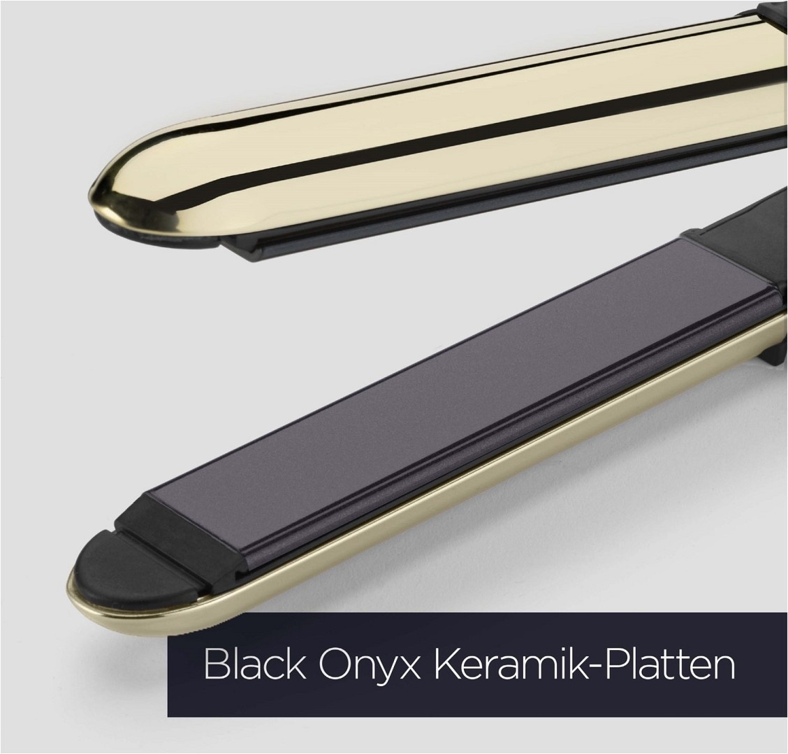 Lange Keramikplatten mit glattem schwarzem Onyx, die für müheloses Styling durch das Haar gleiten.
