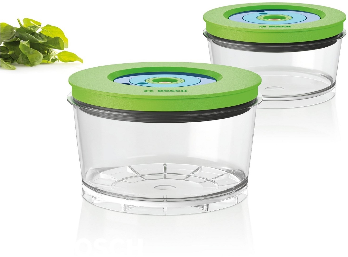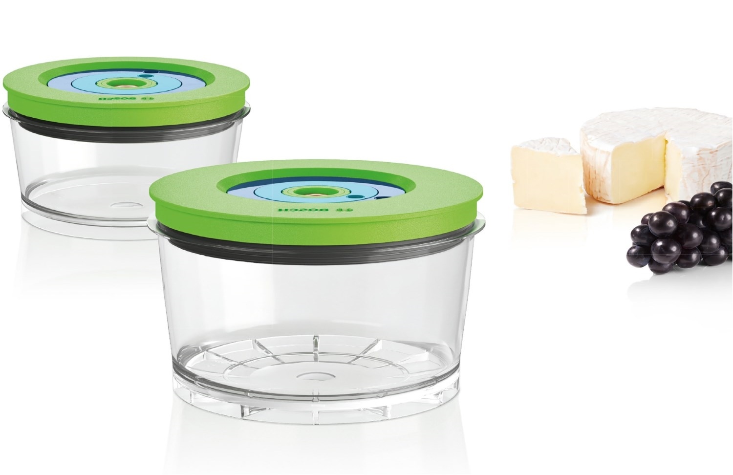 - Zwei Frischhaltedosen mit Vakuum-Ventil - zum Vakuumieren von Speisen mit dem Bosch VitaMaxx Vakuum-Mixer.