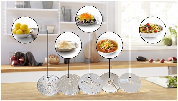 - Enthält 5 Scheiben zur Zubereitung einer Vielzahl von Gerichten (Schneidwendescheibe, Raspelwendescheibe, Reibscheibe mittelfein, grobe Reibscheibe für Knödel und Asia-Gemüse- Scheibe)