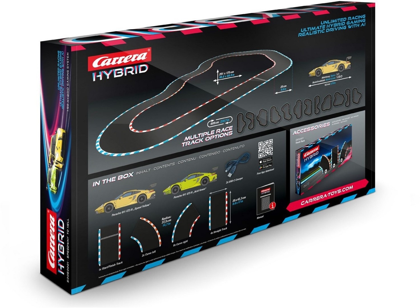 Das Carrera Hybrid - Speedway to Hell Set bringt eine bahnbrechende Innovation in dein Rennspiel-Erlebnis.. In diesem Set enthalten sind zwei detailgetreue Porsche 911 GT3 R Modelle, "Green Acid" und "Speed Yellow", welche dir eine neue Dimension des Rennens eröffnen. Die Streckenkonfiguration umfasst eine Start-/Zielgerade, vier gerade Streckenteile, acht Rechtskurven und zwei Linkskurven, die ein herausforderndes und abwechslungsreiches Fahrerlebnis ermöglichen. Mit den beiliegenden USB-C-Ladekabeln bleiben die Fahrzeuge einsatzbereit. Dieses Set bietet eine perfekte Kombination aus moderner Technologie und klassischem Rennvergnügen.