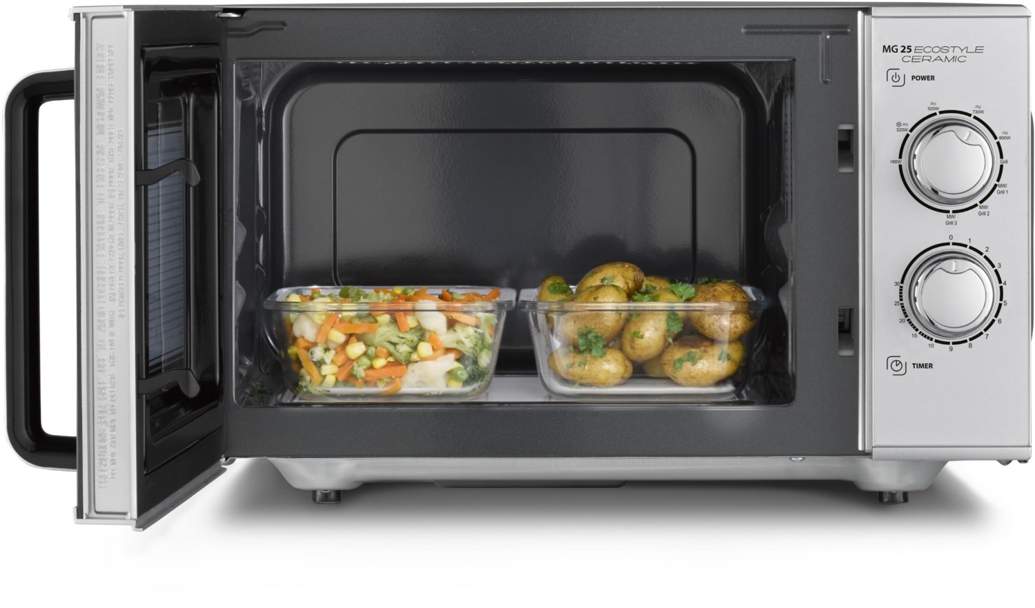 - 5 Mikrowellenstufen, 3 Kombiprogramme (Mikrowelle + Grill) und 1 Grillprogramm