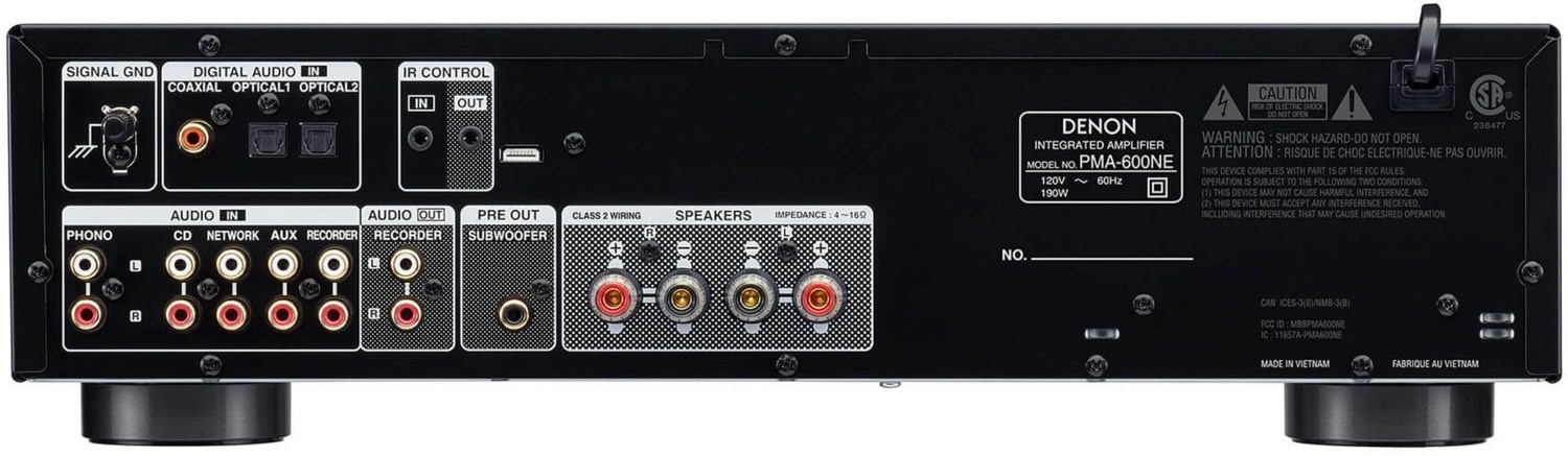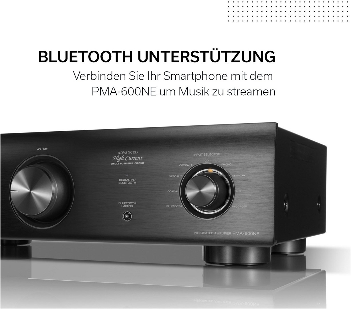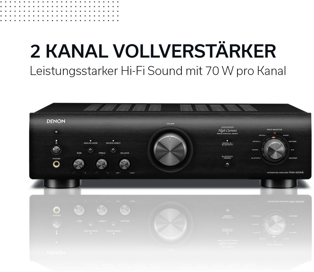 Geschaffen für den anspruchsvollen Musik-Liebhaber ist der Denon PMA-600NE die perfekte Wahl für diejenigen, die Ihr erstes 2 Kanal-HiFi-System aufbauen möchten. Der PMA-600NE wird von einem Denon Advanced High Current-Leistungsverstärker (AHC) mit Hochstrom-Leistungstransistoren in Gegentaktschaltung angetrieben und liefert 70 Watt (bei 4 Ohm) pro Kanal. Verbinden Sie ganz einfach Ihre digitalen und analogen Quellen, über den Phono-Vorverstärker können Sie auch Ihren Plattenspieler anschliessen. Dank des 192kHz/24bit DA-Wandlers erleben Sie Ihre Lieblings-Inhalte in High-Resolution und über Bluetooth können Sie eine nahezu unbegrenzte Anzahl Songs streamen. Der PMA-600NE liefert eine herausragende Soundqualität, die hohe Leistung mit feiner musikalischer Detailzeichnung vereint.