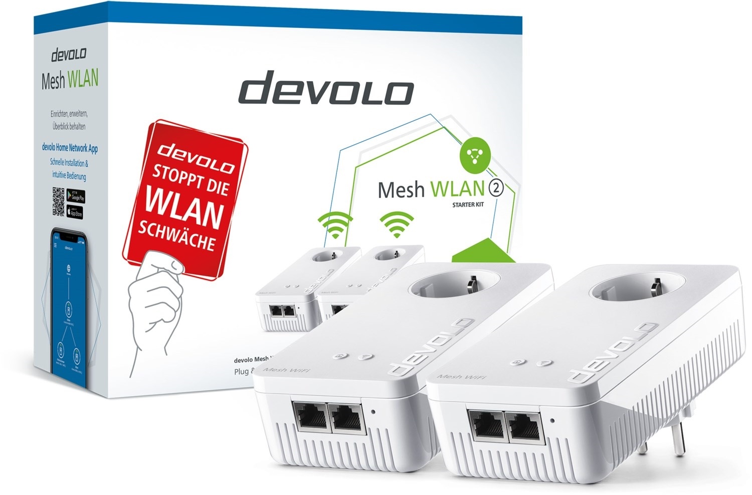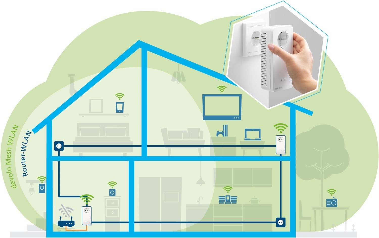 - devolo Mesh WLAN: Alle devolo-Einheiten bilden ein zusammenhängendes Netz, das Ihr Router-WLAN nicht nur verstärkt, sondern optimal ersetzt – für lückenlosen Empfang