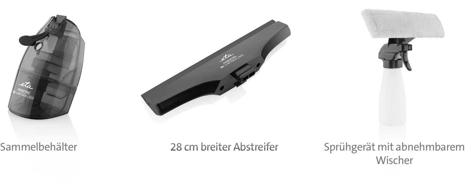 - Zubehör: Abstreifer (28 cm breit), Sprühgerät mit 300-ml-Behälter, abnehmbarer Textilmopp