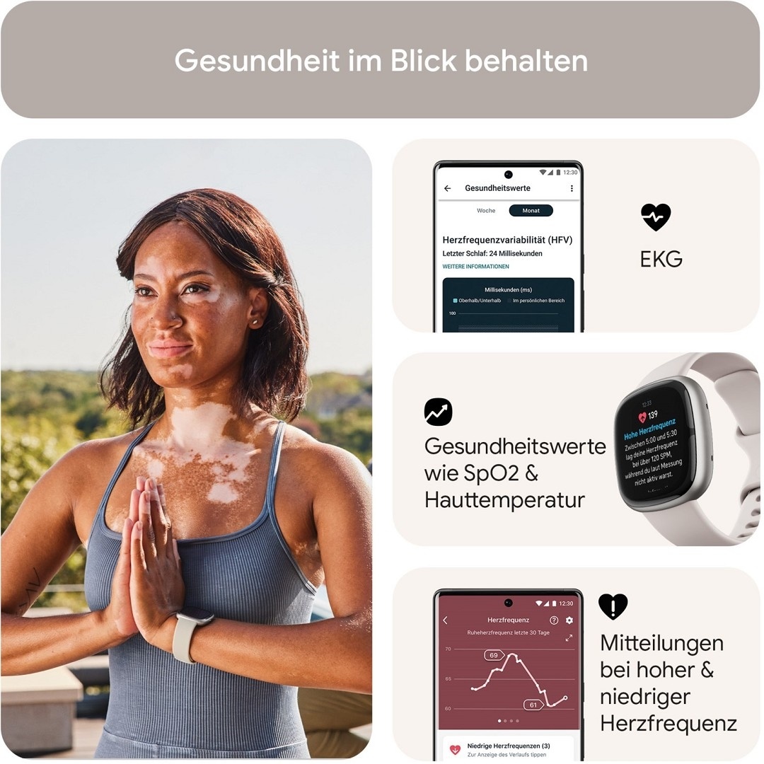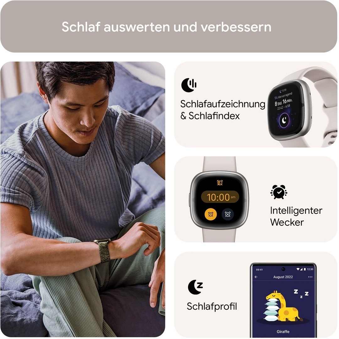 Die Smartwatch erkennt Stress automatisch und gibt dir Tools an die Hand, um ihn zu reduzieren. Durch eine ausführliche Schlafanalyse inklusive Schlafprofil erfährst du mehr über die Qualität deiner Nachtruhe – und wie du sie verbessern kannst. Auch wichtige Aspekte deiner Herzgesundheit hast du mit der Sense 2 jederzeit im Blick. Sie trackt außerdem alle deine Aktivitäten, steckt voller smarter Funktionen für den Alltag und umfasst eine Fitbit Premium-Mitgliedschaft für 6 Monate.