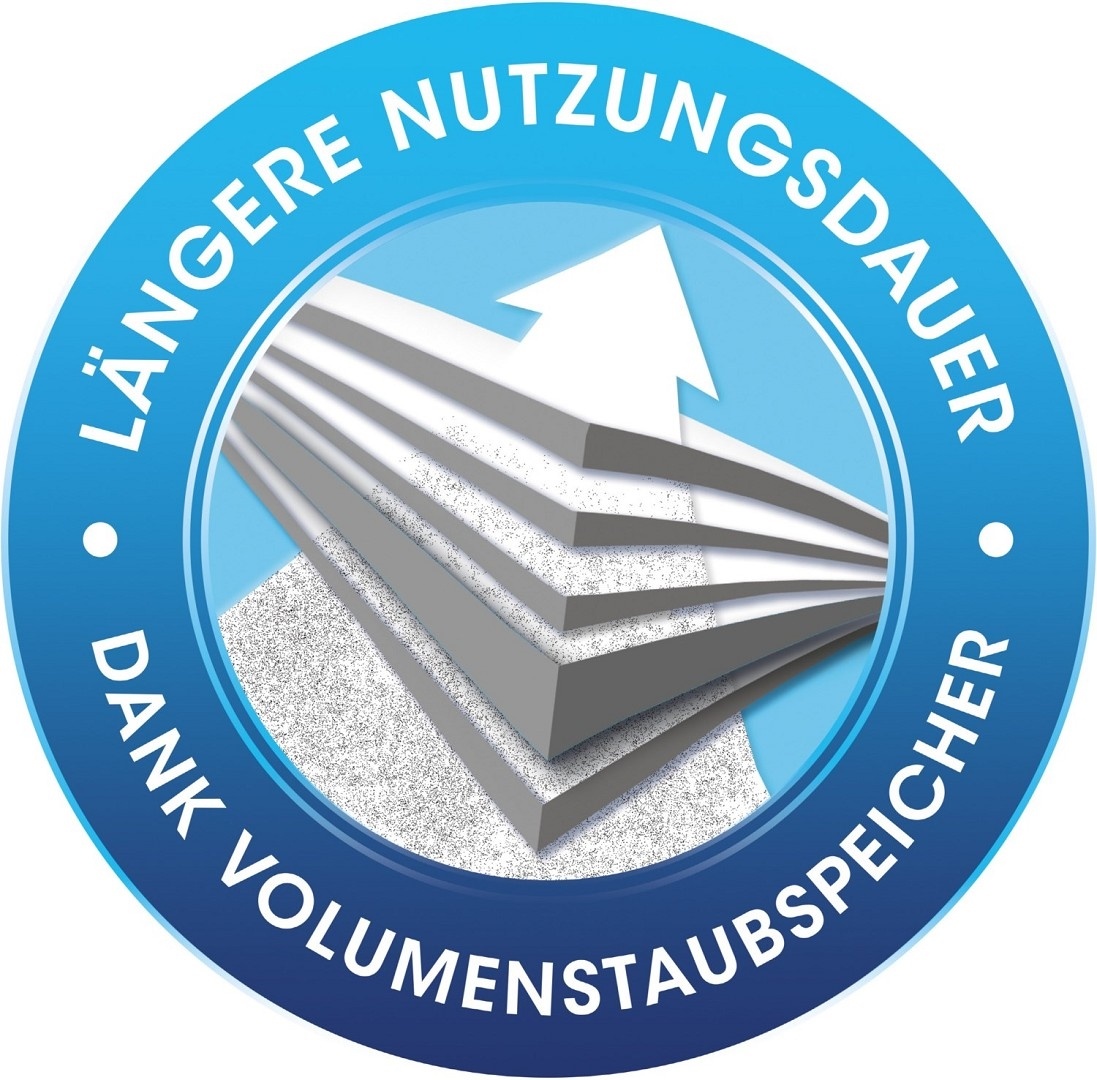Der Volumenstaubspeicher und die abgerundeten Ecken stellen eine optimale Ausnutzung des Staubraums sicher und ermöglichen somit eine längere Verwendungsdauer des Beutels. Sollte der Beutel doch einmal voll sein, ist die Entsorgung dank des praktischem Dirtlock® Staubverschlusses bequem und sauber.